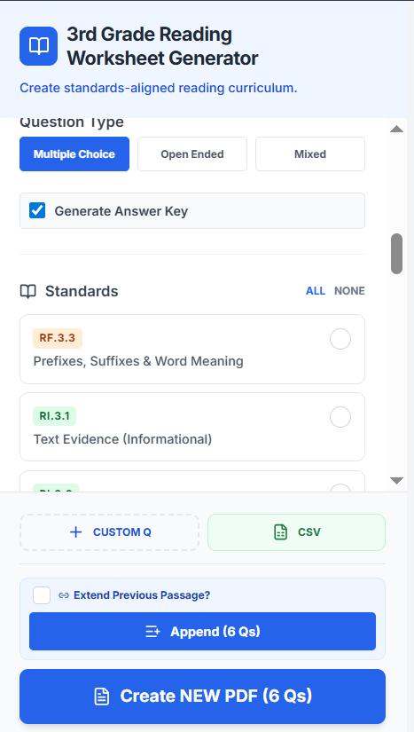 Designed specifically for 3rd grade English Language Arts, this tool allows educators to quickly generate engaging reading passages, comprehension questions, and printable worksheets aligned to key standards.