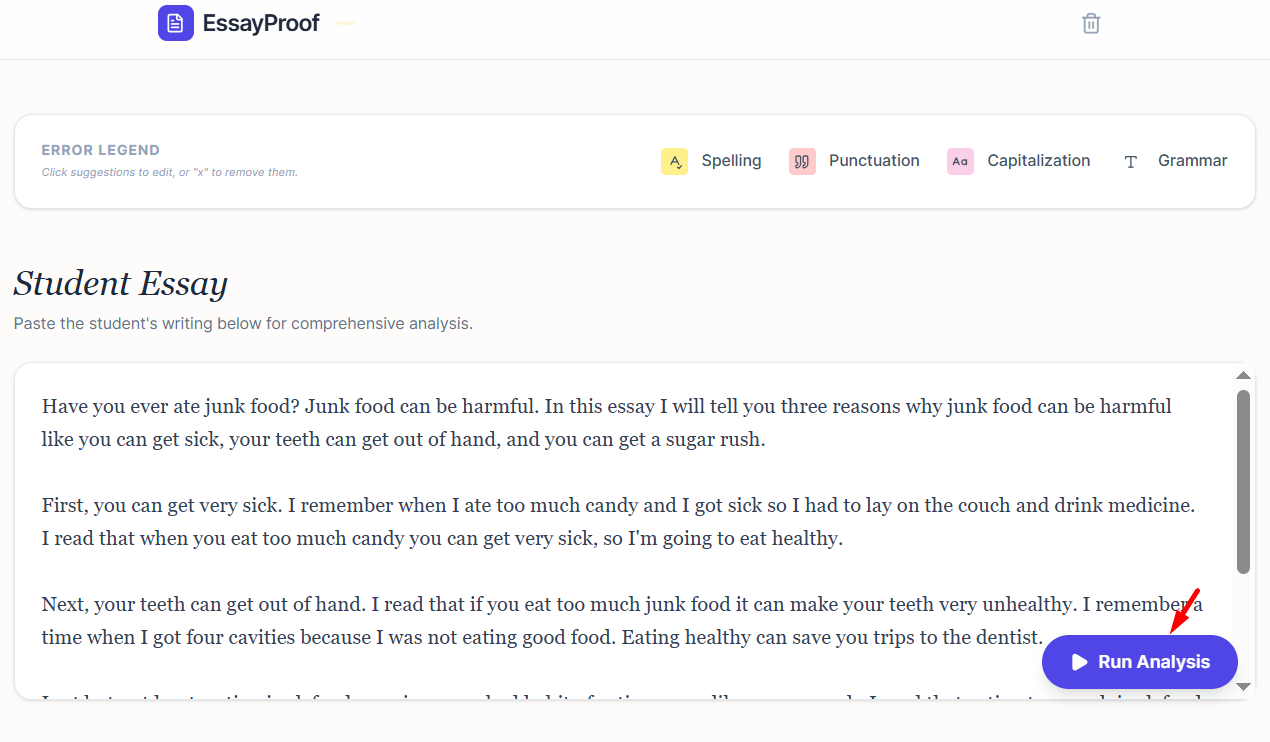EssayProof is a powerful AI-assisted writing tool designed to help students improve their writing while making it easier for teachers to provide meaningful feedback. Simply paste a student’s writing into the tool and EssayProof instantly analyzes the text for spelling, punctuation, capitalization, and grammar errors.