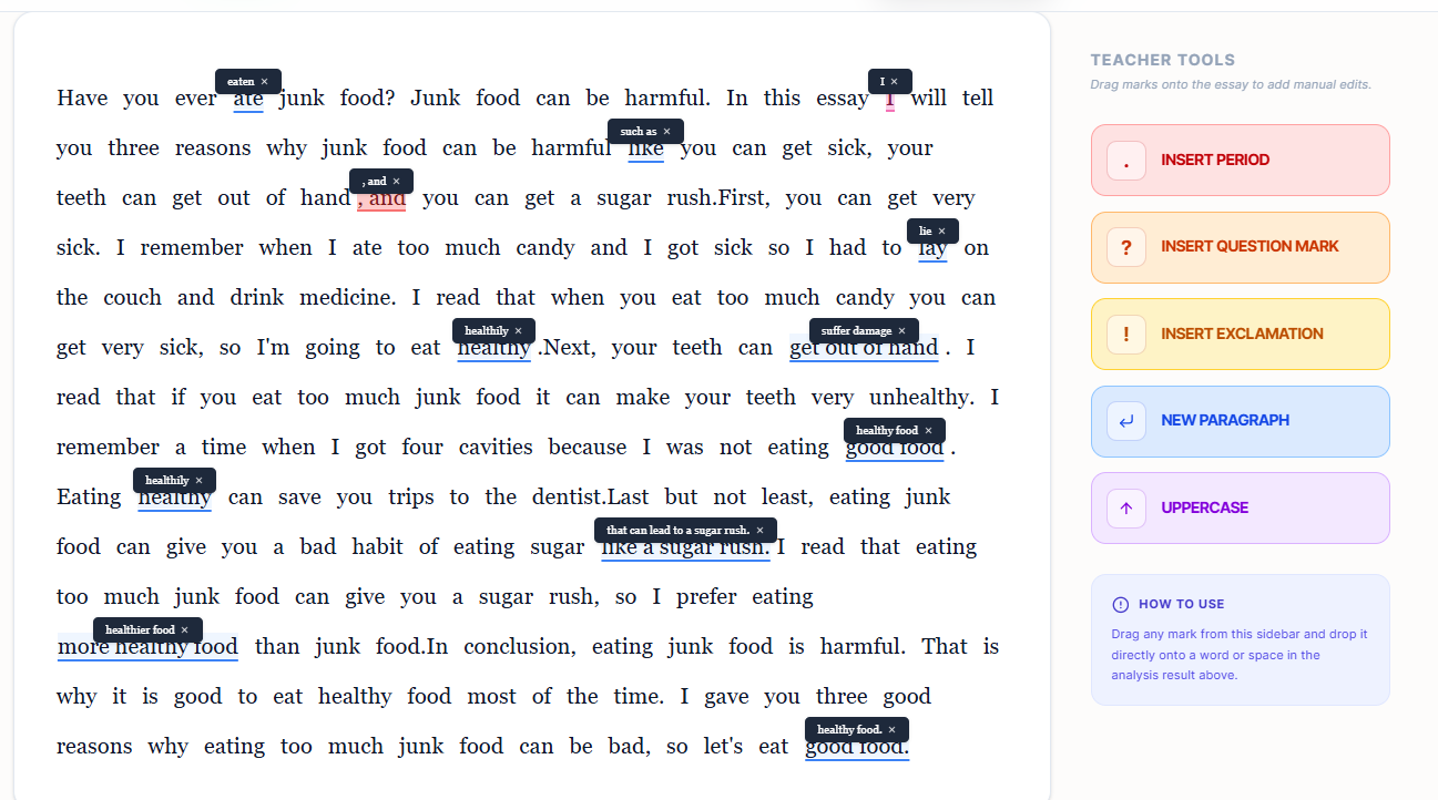 Instead of just correcting the text, EssayProof highlights each issue and shows students exactly what needs to be improved. This encourages students to learn from their mistakes and actively revise their work, rather than simply receiving a corrected version.