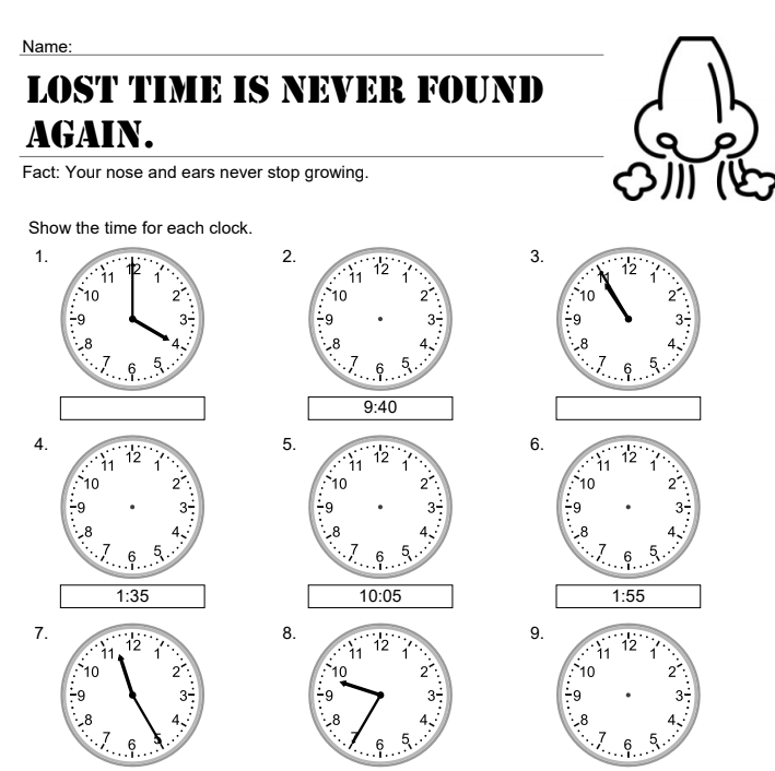 3rd-grade students practice telling time using this worksheet. There are 9 clocks where students have to either draw the clock face or write down the time that a clock is showing. There is also 4 subtraction across zeros using 3 digit numbers as a review.