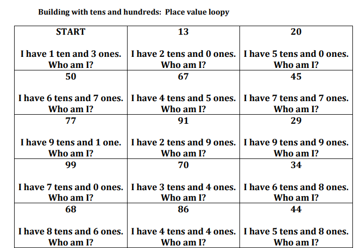Practice your tens and ones place value with your students using this "Loopy" game. Cut out the cards and distribute them to your students.