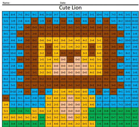 Students complete the 0 to 10 addition and each answer is given a "color" value. The student color in the square the result is a lion. Check out some other coloring math squares here.
