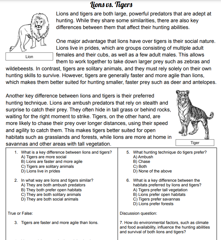 Welcome to our fun and educational worksheet on the differences and similarities between lions and tigers!