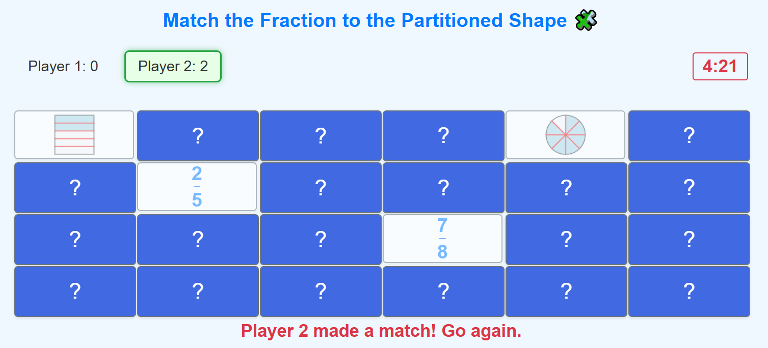 2-Player Fraction Match is a competitive memory-and-math game where students race to match fraction cards with visual models. Players take turns flipping two cards at a time on a 6Ă—4 grid.