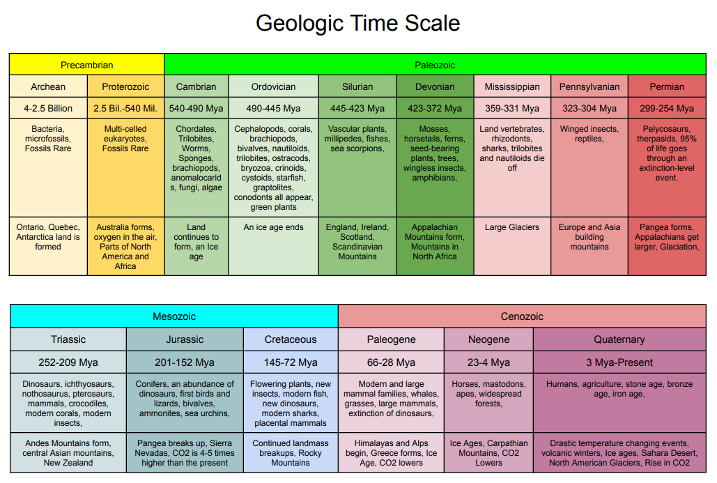 Enhance your knowledge with our geologic time scale, spanning from the ancient Precambrian era, nearly 4 billion years ago, to the vibrant Cenozoic period, which continues to shape the present day.