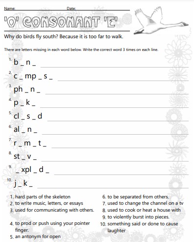 This worksheet will work with students on 'o' consonant 'e' words. Students will first use clues to identify a word that is missing some letters. Then they will write that word 3 times on the line.