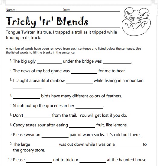 Students will practice their phonics 'tr' blend skill with the cloze reading worksheet. There are 10 questions with 14 'tr' words missing. Students will use the word bank and pick the correct word to fill in the blanks.