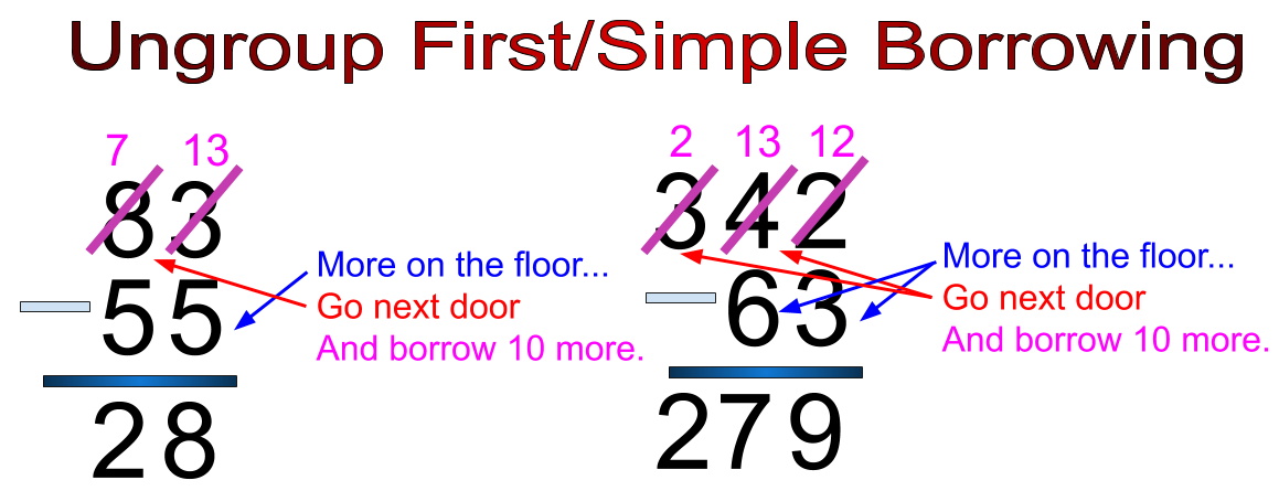 Image anchor chart meant to demonstrate how to borrow when subtracting 2 to 3 digit numbers.