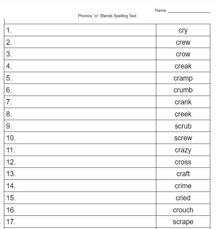 'cr' Blends Spelling Test