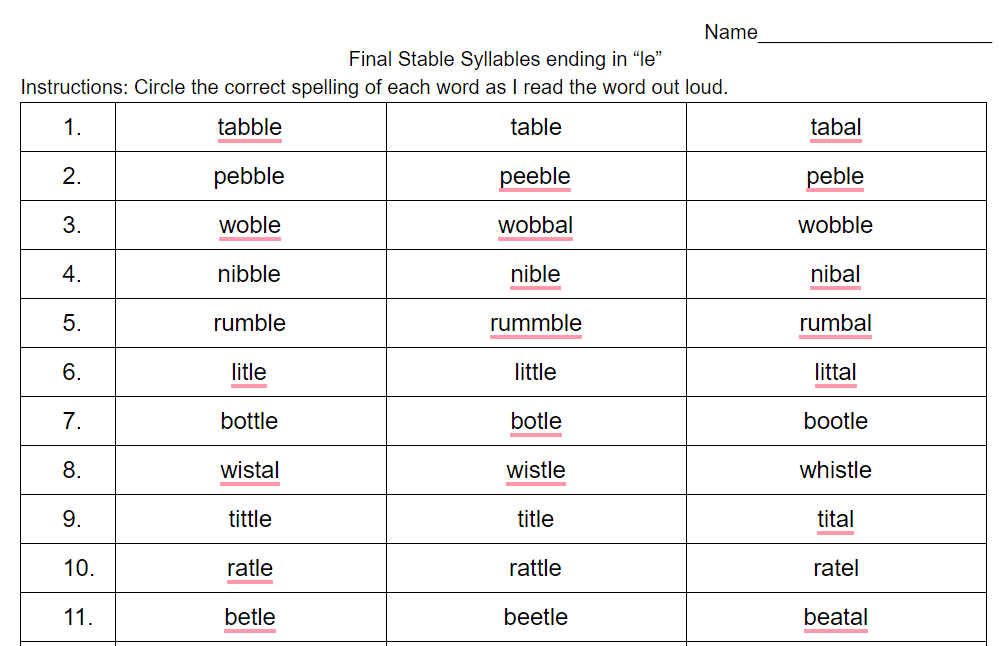 In this elementary phonics activity, the teacher will read a word that ends in -le and the students will circle the correct spelling of it.