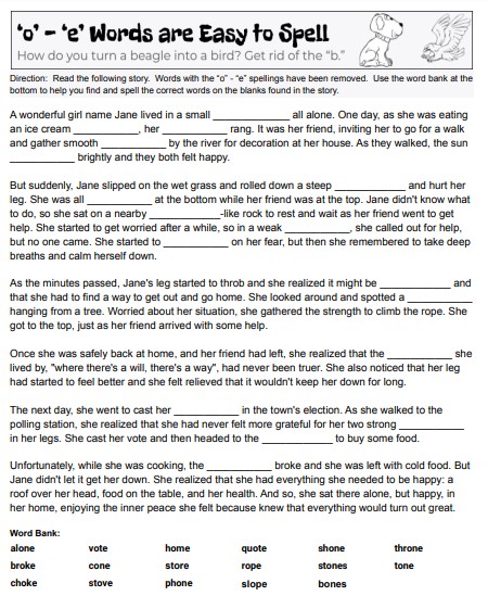 Students will read a story that is missing some words with the 'o'-'e' spelling patterns and then using the word bank place the correct words into the blanks. This can also be taught during a unit on problems and solutions in reading.