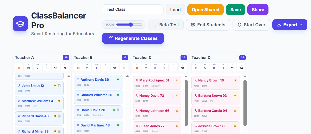 You can easily add, edit, and manage students, assign labels, include notes, and even separate or pair students based on your professional insight. Once your data is entered, the tool generates optimized class groupings instantly—and allows you to regenerate or fine-tune results at any time.