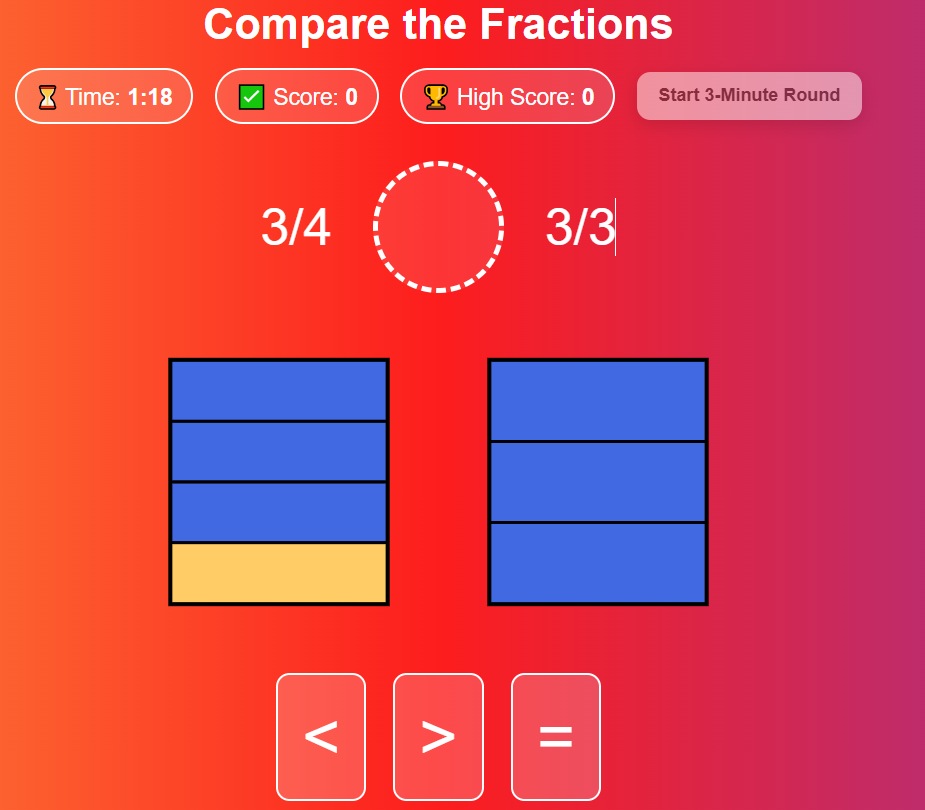 Compare the Fractions is a fast-paced, interactive fraction game that helps students build visual understanding of fraction size using hands-on models and quick comparison practice.