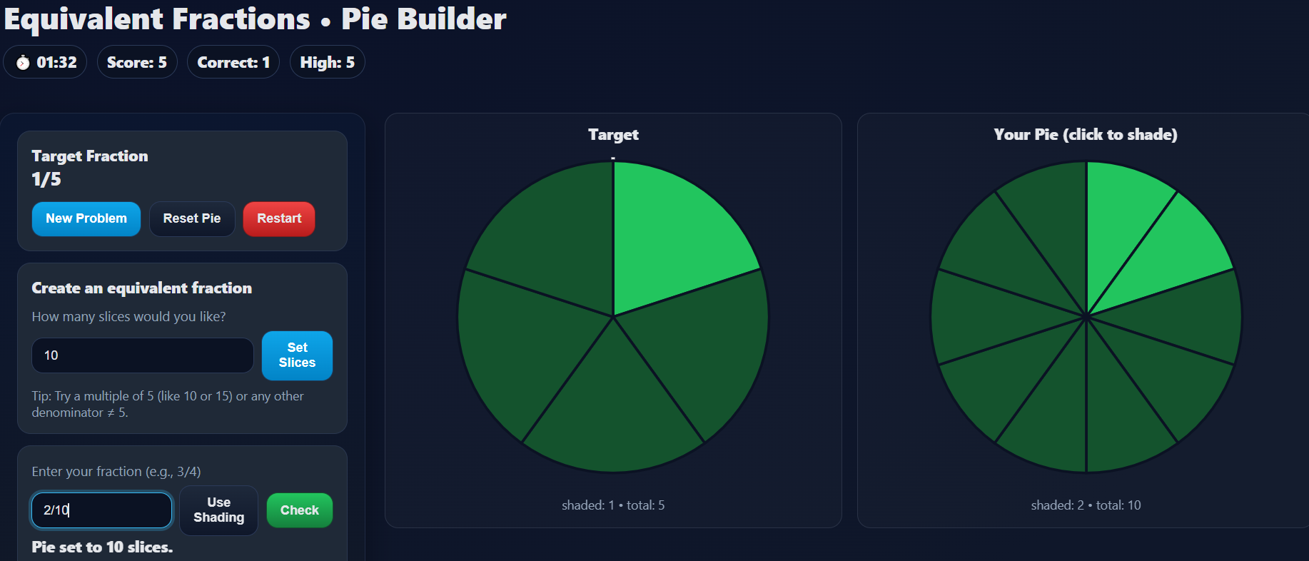 Equivalent Fractions • Pie Builder is an interactive fraction game that strengthens students’ understanding of equivalent fractions by combining visual modeling, student choice, and quick feedback.