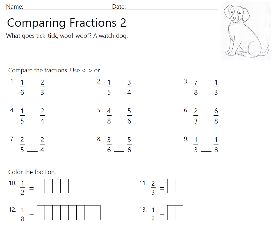 In this 3rd-grade math worksheet, students will compare 9 fractions using <,>, and =. They will color in 6 fraction bars. Finally, students will place 5 fractions on a number line. Some of these fractions have different denominators.