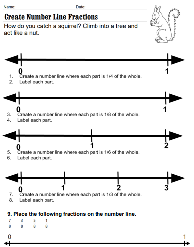 In this 3rd Grade worksheet, students will create fractions on number lines. They will label each part of the fraction.