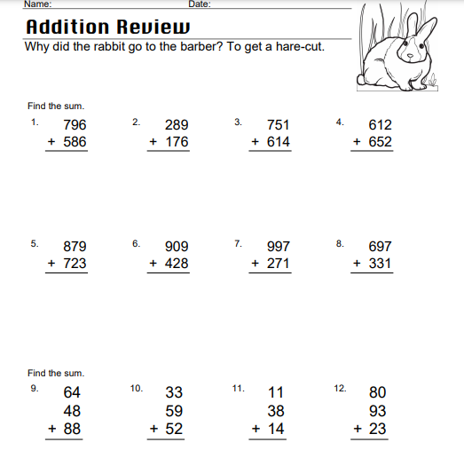 In this worksheet, students will review adding three digits together as well as adding three double-digit values together. It comes with a nice pun about rabbits.
